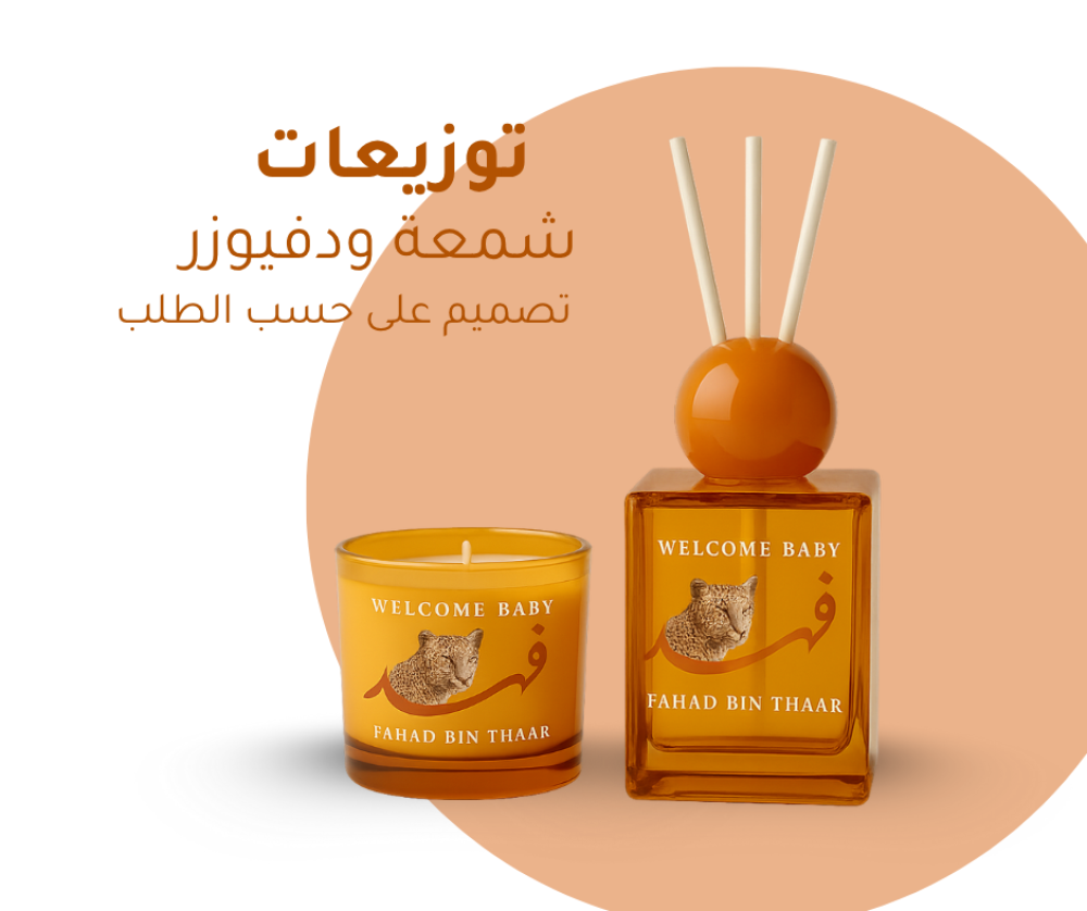 الآن يمكنكِ إضافة طباعة حسب الطلب على كل من الدفيوزر والشمعة، بما يتناسب مع ثيم مناسبتكِ:
